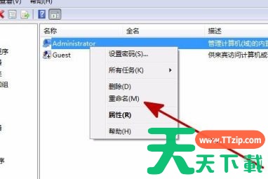10、右键单击右侧窗口的“administrator”,选择“重命名”。