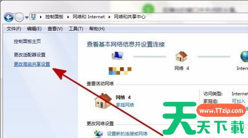 6、返回到“网络和共享中心”窗口,点击“更改高级共享设置”。