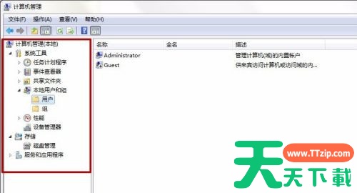 9、在打开的“计算机管理”窗口左侧依次选择“系统工具”--“本地用户和组”--“用户”。