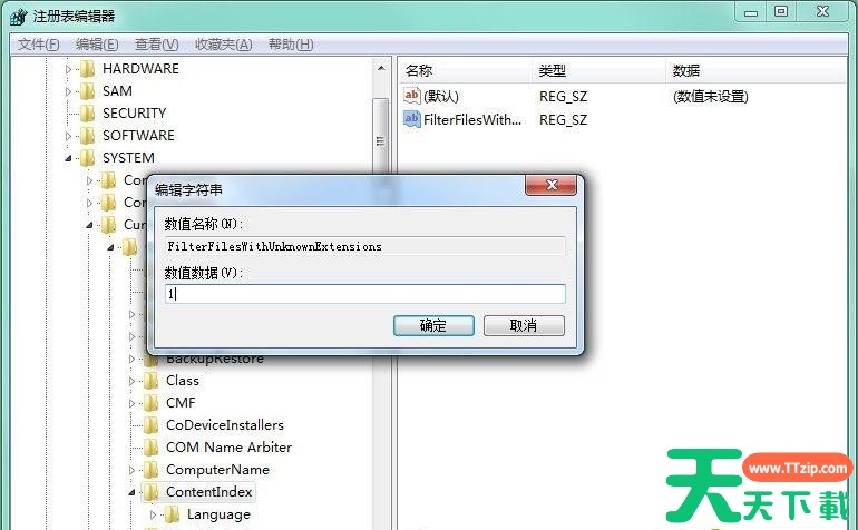 2、在打开的注册表编辑器中依次找到并点击“HKEY_LOCAL_MACHINE\SYSTEM\CurrentControlSet\Control\ContentIndex”选项,然后在右侧找到并双击“FilterFilesWithUnknownExtensions”。(如果没有可自行创建)