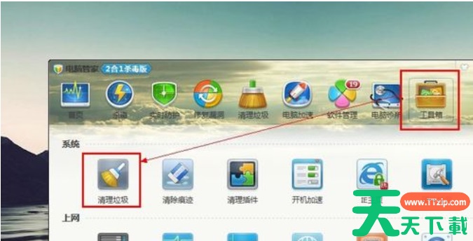 1、打开QQ电脑管家或360卫士,在电脑管家的标签选项卡处点击【工具箱】,然后找到【清理垃圾】工具清理系统垃圾文件。