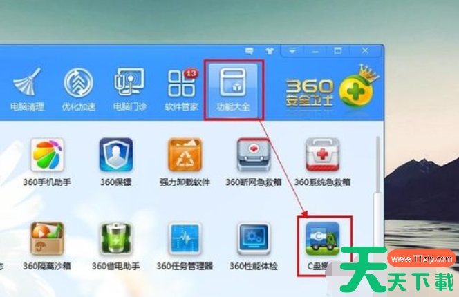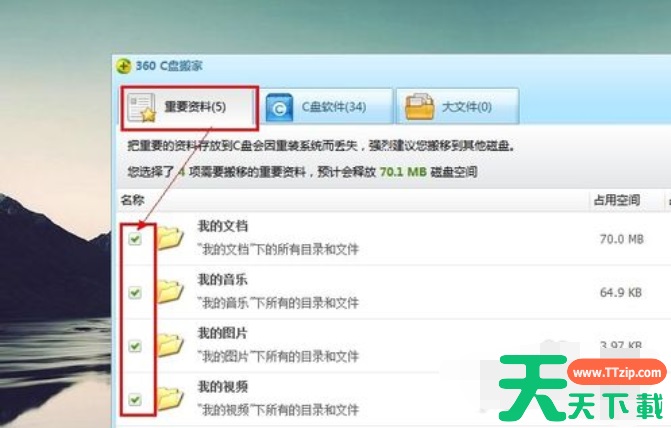 3、打开360卫士,点击【功能大全】选项卡,找到【C盘搬家】工具,打开后,在【重要资料】选项卡下勾选需要搬家的个人文件,然后点击【一键搬资料】按钮移动自己的资料就会将资料搬到其他磁盘,你可以在界面底部选择搬到哪个磁盘。