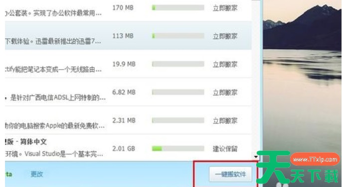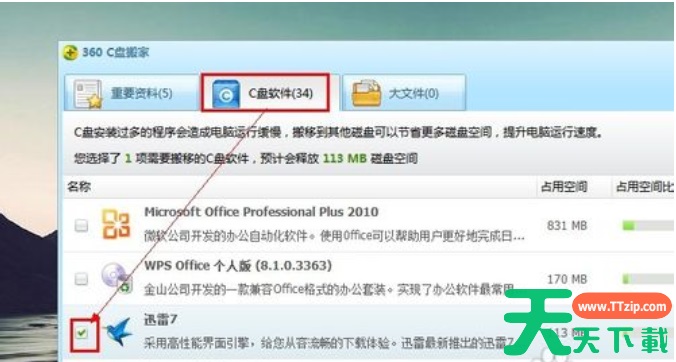 4、切换到【C盘软件】选项卡,选择需要搬家的软件,如迅雷,然后选择搬到哪个磁盘,之后点击【一键搬软件】即可。