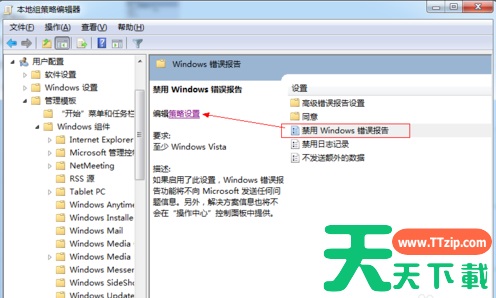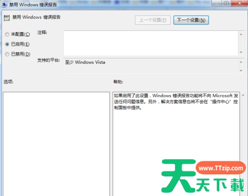 4、在【禁用Windows错误报告】选项中点击【已启用】重启电脑即可。
