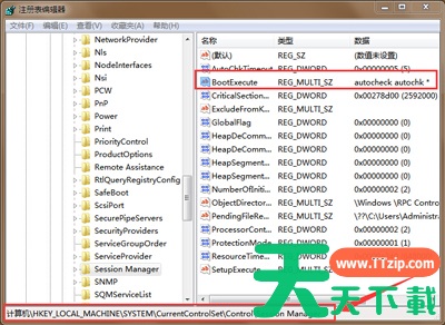 2、在打开的注册表编辑器窗口中,依次展开HKEY_LOCAL_MACHINE\system\CurrentControlSet\Control\Session Manager,并且在右侧的子键窗口中找到BootExecute键值项。