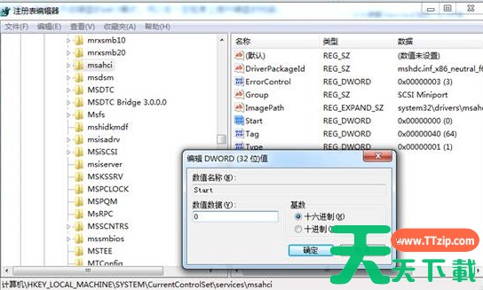 2、打开注册表编辑器之后,进入“HKEY_LOCAL_MACHINE/System/CurrentControlSet/Services/Msahci”键值。在右边窗口中双击名称为“Start”的项目,会弹出一个对话框,将默认的参数由3更改为0。点击“确定”并且保存之后,重新启动电脑。