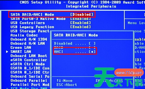 3、重启电脑之后,进入BIOS,在“Integrated Peripherals”页面中,将“SATA RAID/AHCI Mode”更改为“AHCI”(不同BIOS选项名称会有细微差别)。