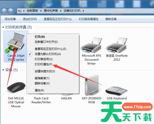 3、打开的界面中找到你要修改的打印机,右键单击,在弹出的菜单中点击打印机属性。