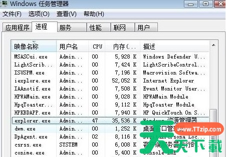 4、向下滚动,找到explorer.exe的进程选择,点击右下角“结束进程”,然后点击右上角文件----》新建任务,在弹出的对话框中输入explorer,确定即可。
