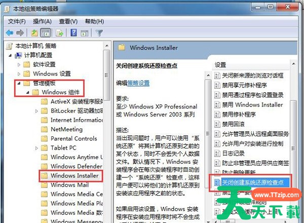 2、运行gpedit.msc组策略里,计算机配置--管理模板--windows组件--windowsInstaller--启用关闭创建系统还原检查点。