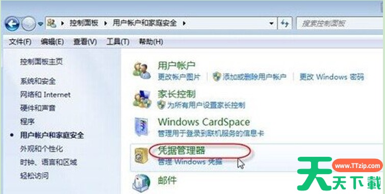 3、此时系统弹出“用户账户和家庭安全”窗口,点击“凭证管理器”链接。