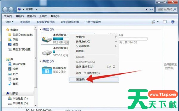 1、鼠标左键双击计算机,然后选择c盘右键单击选择属性打开。