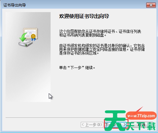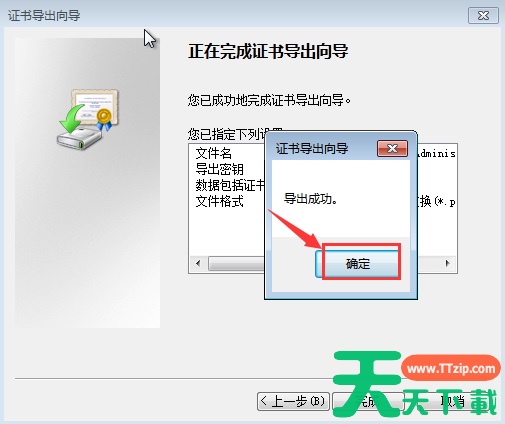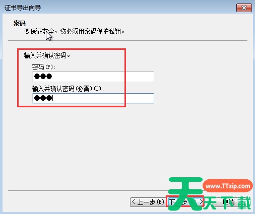 9、 此时会弹出“证书导出向导”,输入并确认密码,接着点击“下一步”。