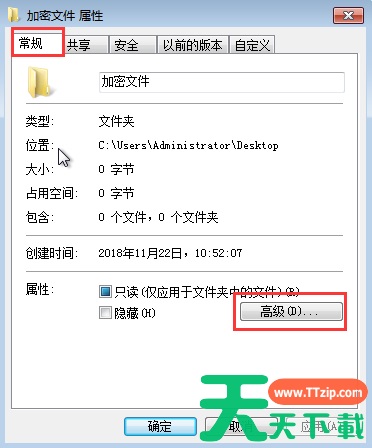 2、 打开属性后,在“常规”选项卡中点击“高级”。