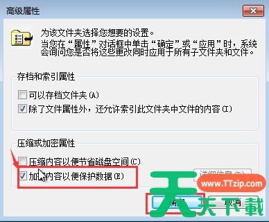 3、 此时会弹出高级属性的窗口,勾选“加密内容以便保护数据”,并点击“确定”,回到加密文件属性后点击“确定”。