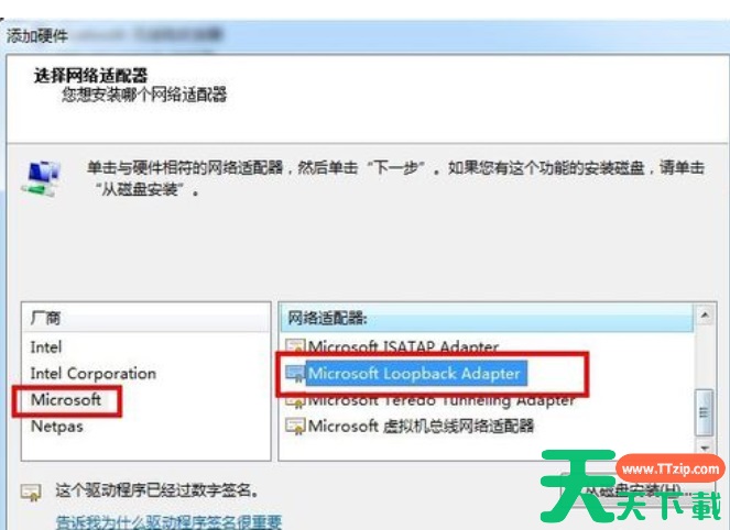 5、选择需要安装的网络适配器,左边选择厂商:microsoft,右边网络适配器选择loopback,点击下一步。