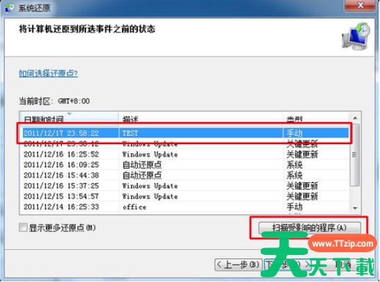 3、最后只要选择最近手动设置过的还原点以及其他自动的还原点都可以,但是最好下一步之前点击“扫描受影响的程序”按钮。