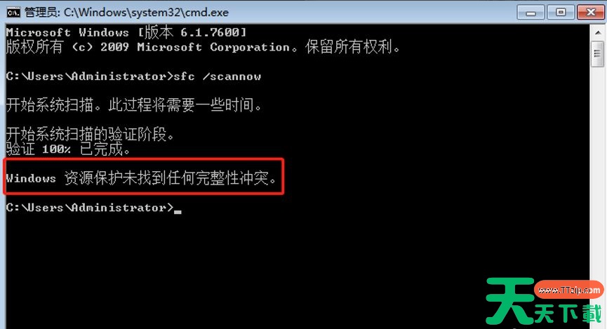 4、如果无损坏的系统文件,电脑会提示“windows资源保护未找到任何完整性冲冲突”。