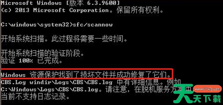 5、反之电脑会对损坏的系统文件进行修复,最后弹出“windows资源保护找到了损坏文件并成功修复了它们”的提示信息。