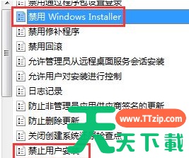 5、在Windows Installer选项下,从右侧的设置选项中找到“禁用Windows Installer”和“禁止用户安装”并点击编辑将设置关闭。