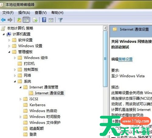 4、然后就是依次展开“计算机配置”、“管理模板”、“系统”和“Internet 通信管理”,然后我们单击“Internet 通信设置”。在列表中找到“关闭 Windows 网络连接状态指示器活动测试”并双击,然后单击“已启用”(默认未配置)。