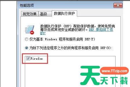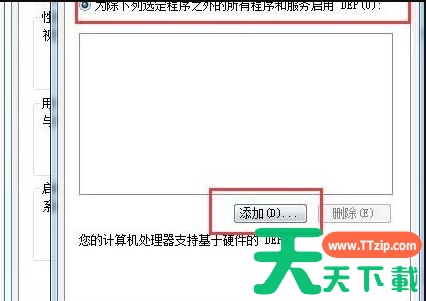 4、再来到【数据执行保护】设置界面。打勾“为除下列选定之外的所有程序和服务启用 DEP(U):”选项。