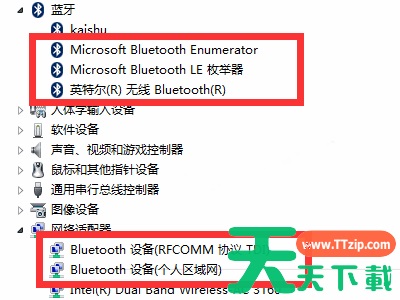 2、点击左上方的“设备管理器”,分别找到蓝牙、网络适配器,并点击文字左边的小三角形标志。若这些选项的前面有黄色感叹号,可以右键点击升级即可。