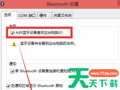 4、在跳出来的“Bluetooth设置”的菜单中,在“选项”的子菜单下,勾选第一项“允许蓝牙设备查找这台电脑”,然后点击最下方的“确定”即可。