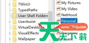 6、接着回到注册表编辑器,用同样的方法打开“user shell folders”下的“personal”文件。