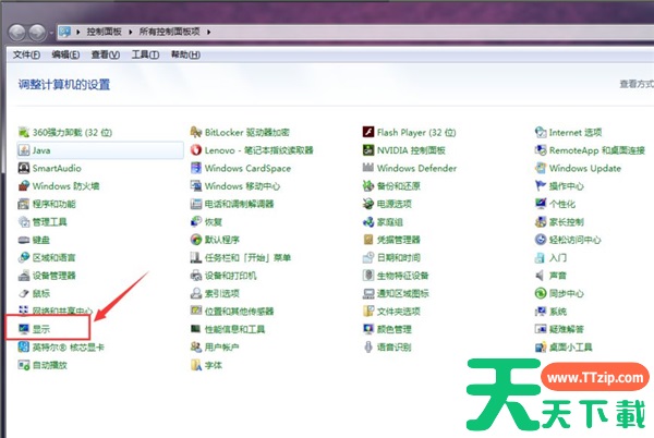 3、进入到【控制面板】的详细列表中找到【显示】选项,点击进入显示的详细页面进行设置。