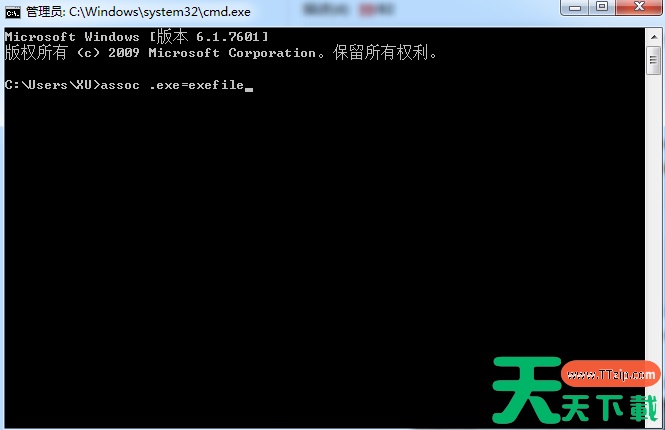 2、在弹出的”命令提示符“窗口中输入”assoc .exe=exefile“,就可以解决问题。