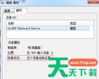 4、查看键盘设备状态是否正常运转,如果显示不正常我们就点右下角的“属性”来更新键盘驱动,最后重启就可。