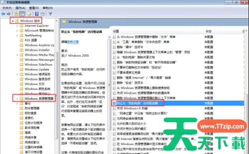 2、在左侧窗口中依次打开:用户配置—管理模块—Windows组件—Windows资源管理器,在右侧找到并打开防止从“我的电脑”访问驱动器,双击打开。