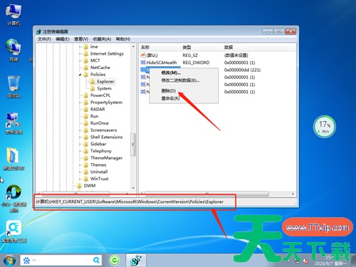 3、然后依照图中路径找到:Explorer文件夹,然后右击“NoViewContextMenu”注册表,点击删除,然后重启计算机即可。