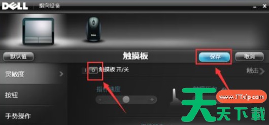 6、出现触摸板控制面板,将触摸板开关关闭,点击保存,你的触摸板就关闭了。
