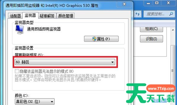5、在监视器选项的下方可以看到目前的屏幕刷新率是60赫兹,我们需要把这个改大一点,点击后方的下拉箭头。