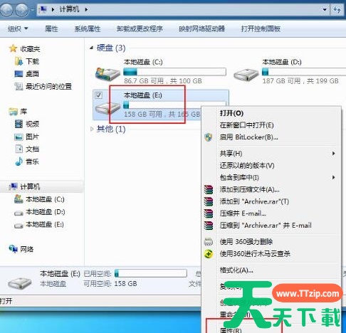 1、以e盘为例。打开“计算机”,并点击“e盘”右击“属性”。