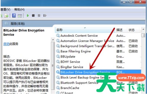 5、在服务中找到【Bit Locker Drive Encryption Service】,这个是蓝牙,如果状态里没有显示启动就点击这个服务。