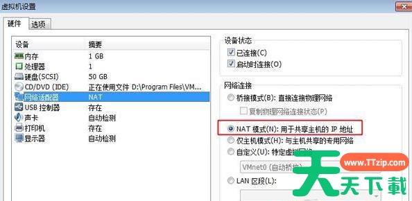 3、点击网络适配器,选择“NAT模式:用于共享主机的IP地址”,确定,最后我们就能发现网络图标红叉消失,可以连接上网了。