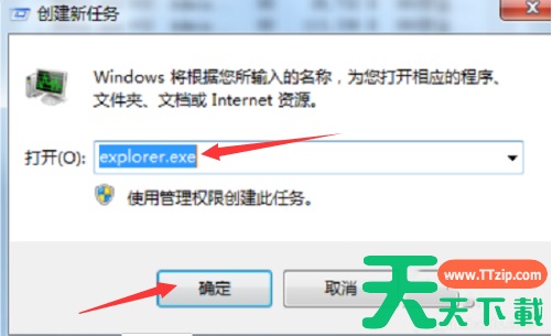 5、在弹出窗口中输入“explorer.exe”,然后“确定”。