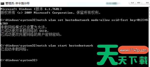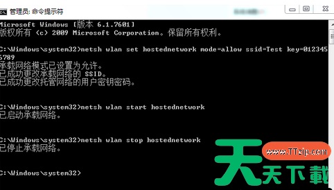 2、然后在“命令提示符”里输入“netsh wlan set hostednetwork mode=allow ssid=Test key=0123456789”(ssid是无线网络名称、key就是密码),点击回车,系统会自动虚拟出一个WiFi热点。