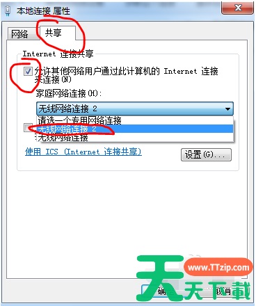 7、在属性界面下点击“共享”选项卡,勾选允许其他网络用户连接此计算机,在下方的选择框内选择“无线连接2”。