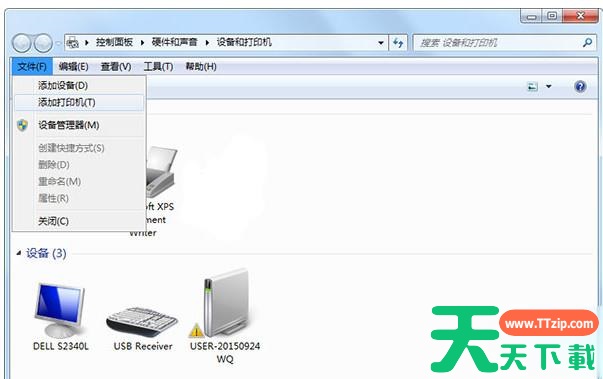 点击开始菜单,选择设备和打印机,打开之后,单击文件—添加打印机。