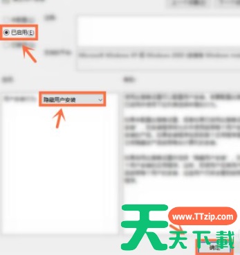 最后,我们勾选【已启用】并打开【隐藏用户安装】,然后点击【确定】即可。