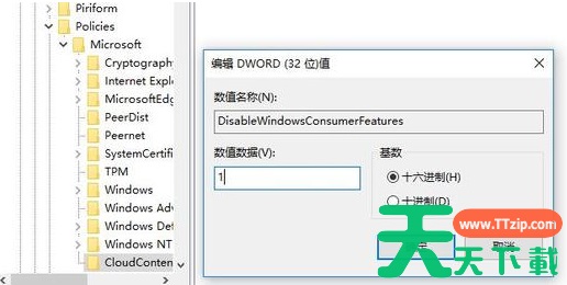 3、在左侧Windows项上单击右键,选择“新建”然后将其重命名为“CloudContent”。在CloudContent的右侧,新建名为DisableWindowsConsumerFeatures的DWORD(32位)或QWORD(64位)值,数值数据设置为1。