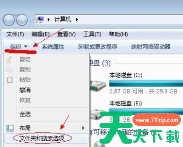 2、点击窗口顶部靠左位置的“组织”菜单,选择其中的“文件夹和搜索选项”。