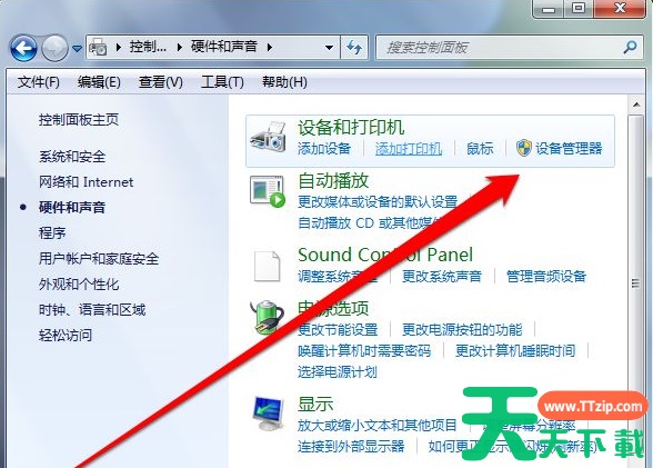 2、在控制面板中,点击硬件声音,选择设备管理器。