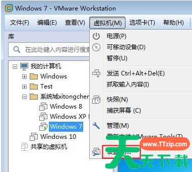 2、选择虚拟机系统,点击菜单栏“虚拟机”,选择“设置”。