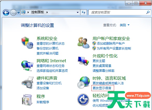 1、点击“开始菜单栏——控制面板 ”,在“时钟、语言和区域”下方,选择“更改显示语言”。