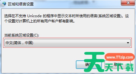 3、在弹出的“区域和语言设置”窗口中,把“非Unicode程序中所使用的当前语言”更改为“中文(简体,中国)”,点击“确定”即可关闭窗口。如果已经是“简体中文”,可以先改为其它的语言,然后再改回“简体中文”,就可以修复中文显示乱码的问题了。